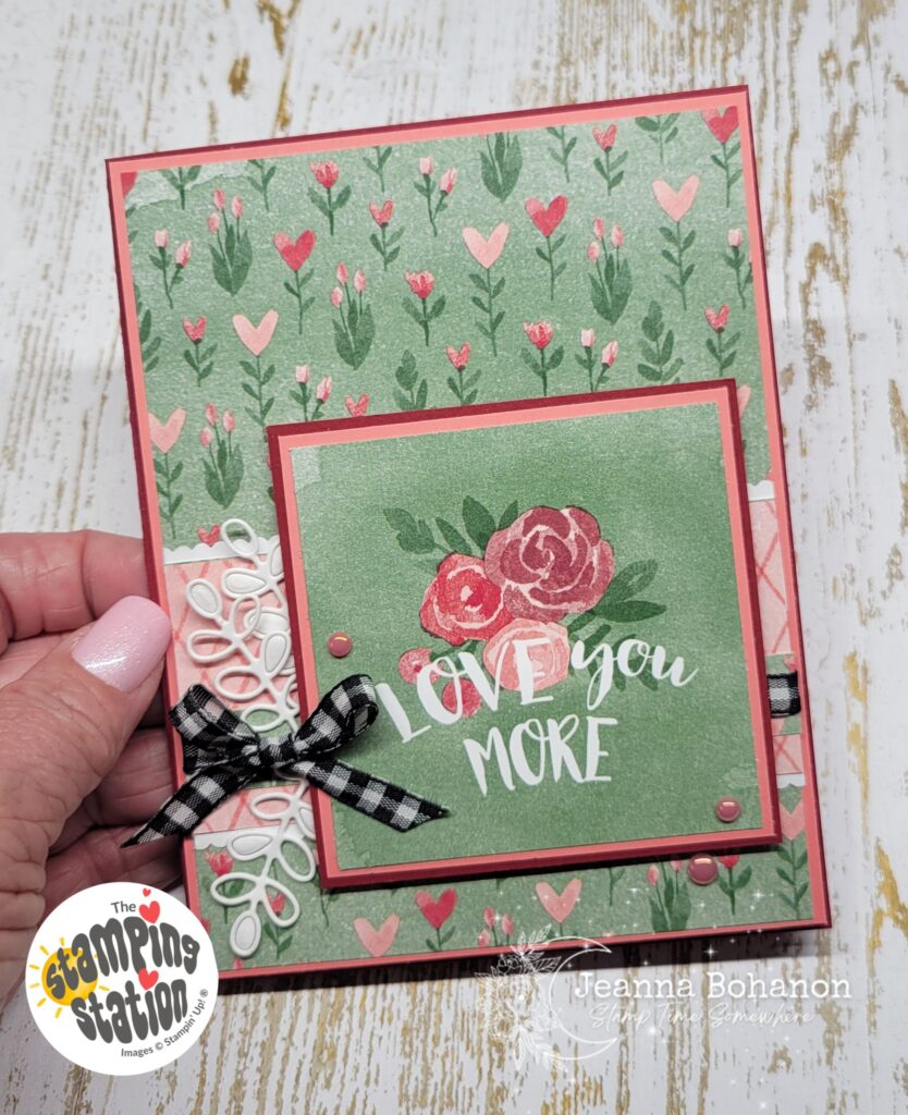 So there was ZERO stamping on this card!!!! I totally depended on the Love Notes 6″ x 6″ Designer Series Paper, and an adaptation of Friday’s #tgifchallenges sketch. I did layer a little, using coordinating Flirty Flamingo and Cherry Cobbler Cardstocks for the base, and behind the image I chose as the main sentiment. I also added a cute little scallop by using one of Stampin’ Up!’s older punches. I also used some older Gingham Ribbon. I kind of wish I had a lifetime stash of it, honestly. Gingham has always been one of my favorites, and if you have followed me for any length of time, you’ll know that I LOVE pops of black, especially with the gingham. I like how it offsets the watercolor look of the images in the paper.